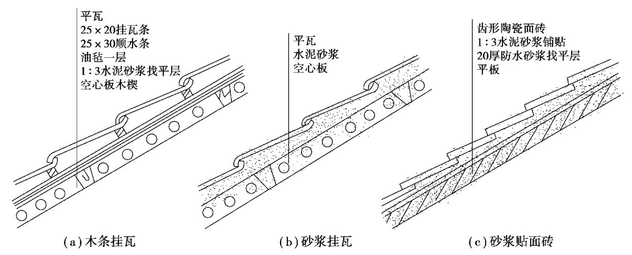 坡屋顶屋面组成前面已述。 盖料种类有机平瓦、小青瓦、筒瓦、石棉水泥瓦、玻璃钢瓦等,而基层的构造层次则随盖料和质量要求的不同而定。