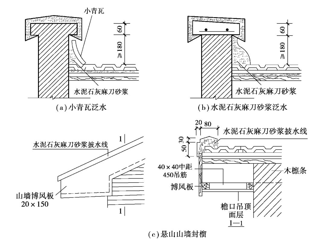 ①山墙挑檐:又称悬山。 利用屋顶檩条的延长出挑,上铺屋面板,挂瓦,出挑檩条端部用木板封檐(也称博风板)而形成。 山墙檐边铺设的瓦,为避免脱落应用1∶2水泥麻刀或其他纤维砂浆做转角封边(坡水线)固瓦。 如图10.31所示。