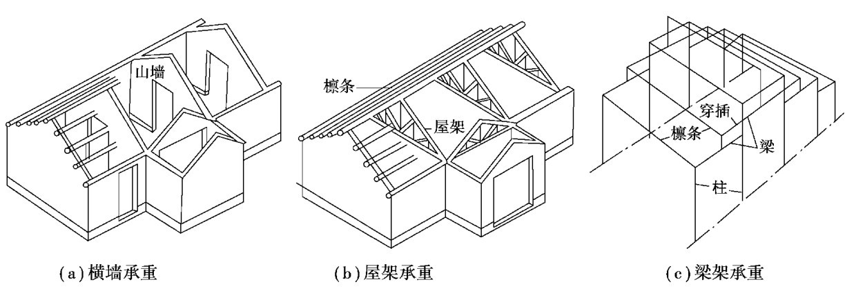 当房屋开间小时,将内外横墙砌成尖顶形状,其上直接搁置檩条以承载屋顶重量。 称山墙承重或硬山搁檩。