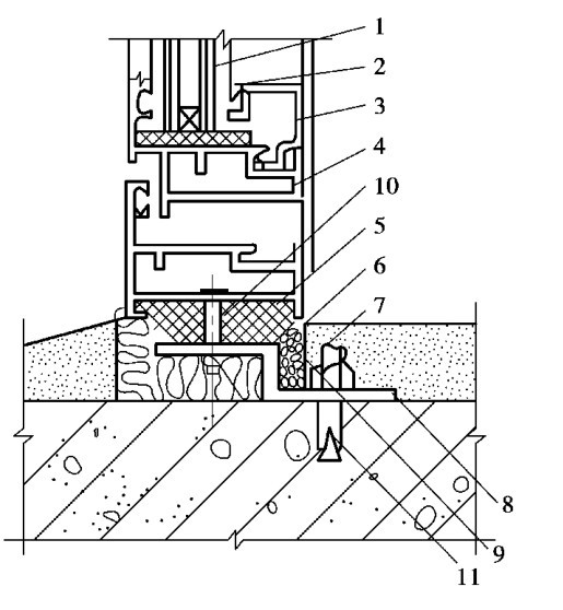 1—玻璃;2—橡胶条;3—压条;4—内扇;5—外框;6—密封膏;7—砂浆;8—地脚;9—软填料;10—塑料垫;11—膨胀螺栓