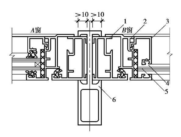 1—外框;2—内扇;3—压条;4—橡胶条;5—玻璃;6—组合杆件