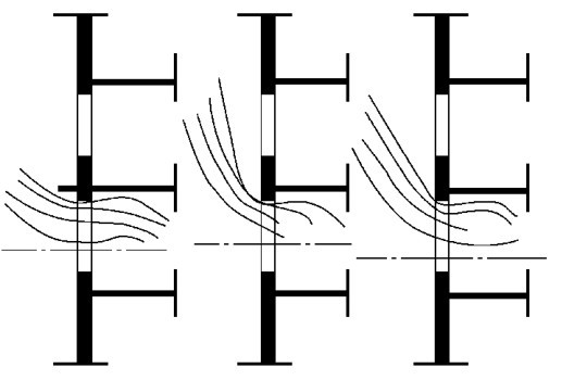 在现代建筑中,火通过外墙窗口喷出烟气和火焰,沿窗间墙及上层窗口窜到上层室内,这样逐层向上蔓延,会使整个建筑物起火,如图13.1所示。 若采用带形窗更易吸附喷出向上的火焰,蔓延更快。 为了防止火势蔓延,要求上、下层窗口之间的距离,尽可能大些。 要利用窗过梁、窗楣板或外部非燃烧体的雨篷、阳台等设施,使烟火偏离上层窗口,阻止火势向上蔓延。