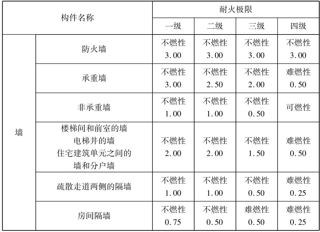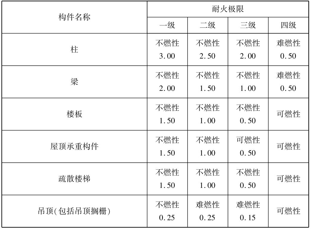 表13.1 不同耐火等级建筑相应构件的燃烧性能和耐火极限(h)