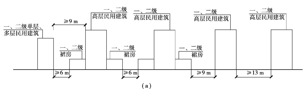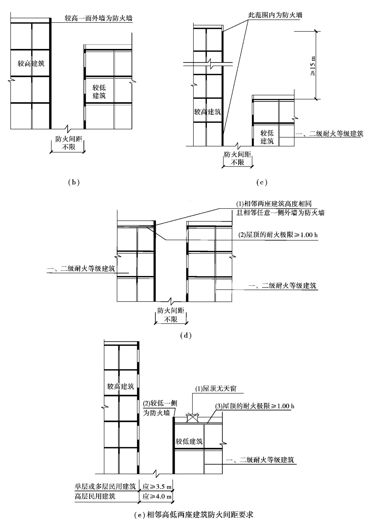 ②两座建筑相邻较高一面外墙为防火墙(图13.2(b)),或高出相邻较低一座一、二级耐火等级建筑的屋面15m及以下范围内的外墙为防火墙时,其防火间距不限(图13.2(c))。