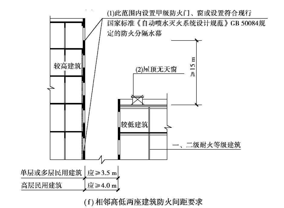 ⑤相邻两座建筑中较低一座建筑的耐火等级不低于二级且屋顶无天窗,相邻较高一面外墙高出较低一座建筑的屋面15m及以下范围内的开口部位设置甲级防火门、窗,或设置符合现行国家标准《自动喷水灭火系统设计规范》GB50084规定的防火分隔水幕时,其防火间距不应小于3.5m;对于高层建筑,不应小于4m(图13.2(f))。