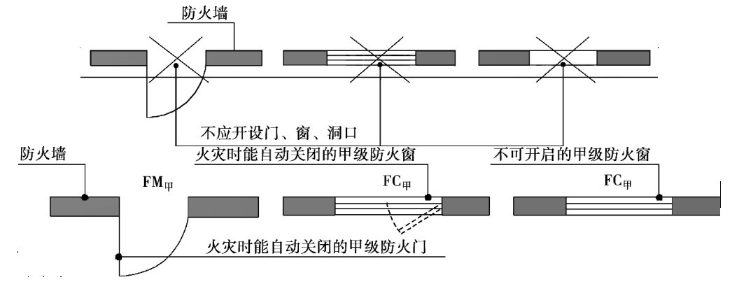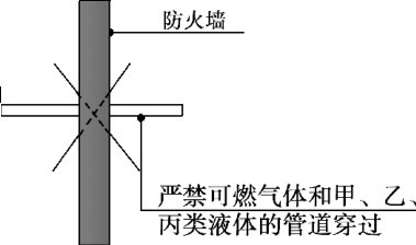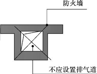 防火墙上不应开设门窗洞口,当必须开设时,应设置能自行关闭的甲级防火门、窗(图13.9)。输送可燃气体和易燃、可燃液体的管道,均严防穿过防火墙,防火墙内不应设置排气道(图13.10);其他管道也不宜穿过防火墙,如必须穿过时,应采用非燃烧材料将其周围的空隙紧密填塞。 穿过防火墙的管道的保温材料应采用非燃材料(图13.11)。