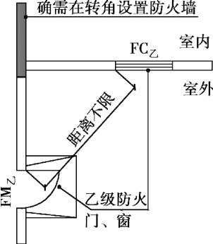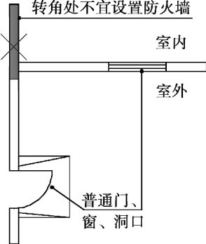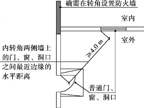 民用建筑的防火墙不宜设在U,L形建筑物的转角处(图13.6)。 如设在转角附近,内转角两侧墙上的门窗洞口之间最近的水平距离不应小于4m(图13.7);当相邻一侧装有固定一级防火窗时,距离可不受限制(图13.8)。 紧靠防火墙两侧的门窗洞口之间最近的水平距离不应小于2.00m。 当水平间距小于2.00m时,应设置固定一级防火门、窗。
