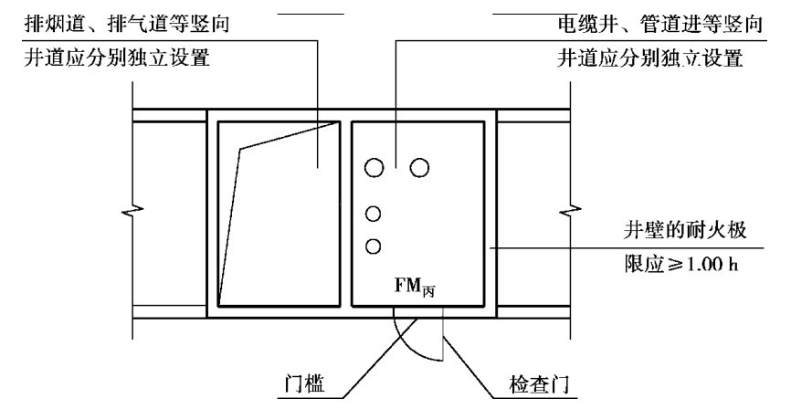 电缆井、管道井、排烟道、排气道、垃圾道等竖向管道井,应分别独立设置。 其井壁应为耐火极限不低于1.00h的不燃烧体,井壁上的检查门应采用丙级防火门(图13.16)。
