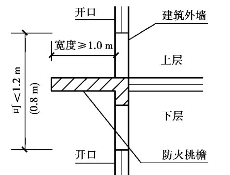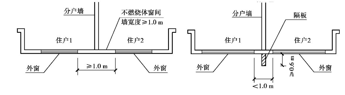 建筑外墙上、下层开口之间应设置高度不小于1.2m的实体墙或宽度不小于1.0m、长度不小于开口宽度的防火挑檐(图13.14);住宅建筑外墙上相邻户开口之间的墙体宽度不应小于1.0m;小于1.0m时,应在开口之间设置突出外墙不小于0.6m的隔板(图13.15)。 防火挑檐和隔板的耐火极限和燃烧性能均不应低于相应耐火等级建筑外墙的要求。