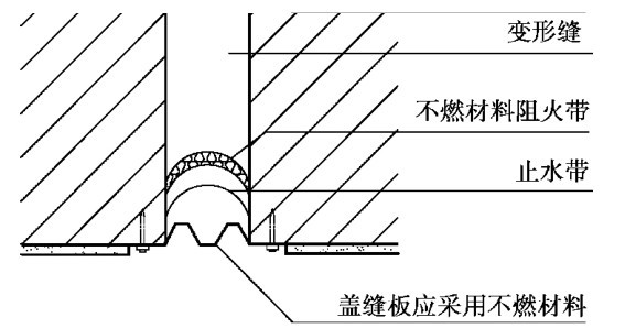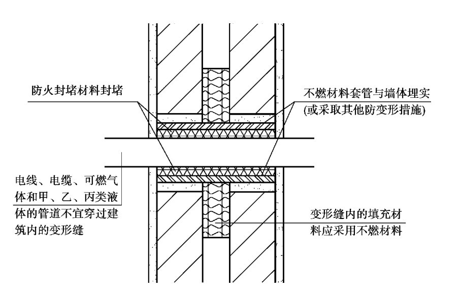 变形缝构造基层应采用不燃烧材料(图13.17)。电缆、可燃气体管道和甲、乙、丙类液体管道,不应敷设在变形缝内。 当其穿过变形缝时,应在穿过处加设不燃烧材料套管,并应采用不燃烧材料将套管空隙填塞密实(图13.18)。
