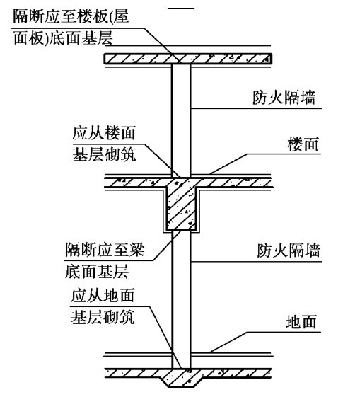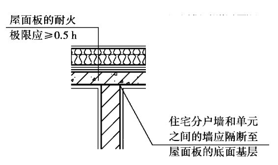 建筑物内的防火隔墙应从楼地面基层隔断至梁、楼板或屋面板的底面基层(图13.12),屋面板的耐火极限不应低于0.5h(图13.13)。