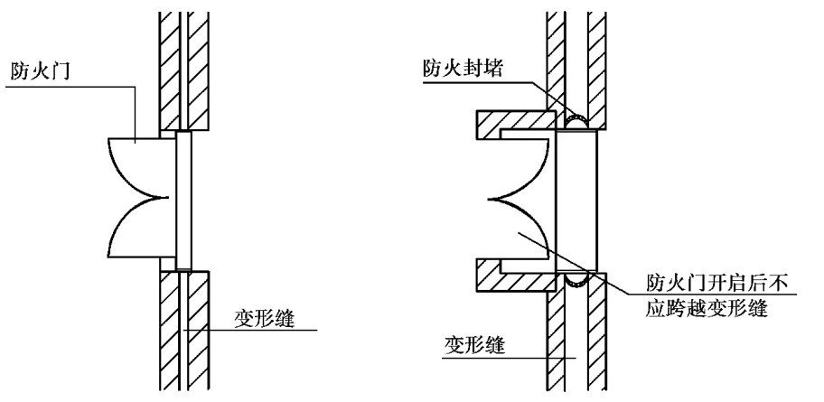 防火门、防火窗应划分为甲、乙、丙三级,其耐火极限甲级应为1.20h、乙级应为0.90h、丙级应为0.60h。 防火门应为向疏散方向开启的平开门,并在关闭后应能从任何一侧手动开启。用于疏散的走道、楼梯间和前室的防火门,应具有自行关闭的功能。 双扇和多扇防火门,还应具有按顺序关闭的功能。 常开的防火门,当发生火灾时,应具有自行关闭和信号反馈的功能。设在变形缝处附近的防火门,应设在楼层数较多的一侧,且门开启后不应跨越变形缝(图13.19)。