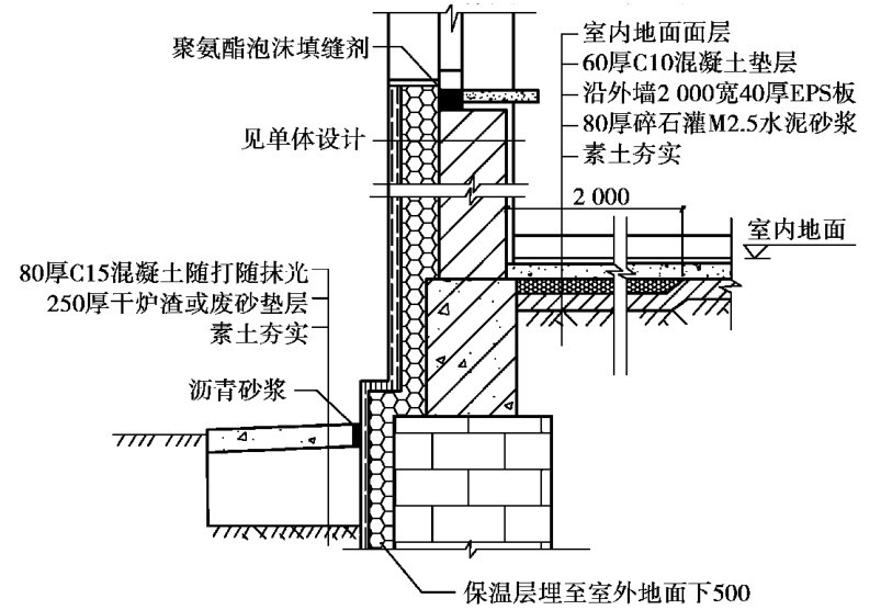 内保温复合墙体在构造上不可避免地形成热工薄弱节点,如混凝土过梁、各层楼板与外墙交接处、内外墙相交处等一些保温层覆盖不到的部位会产生冷桥,需要采取必要的加强措施。