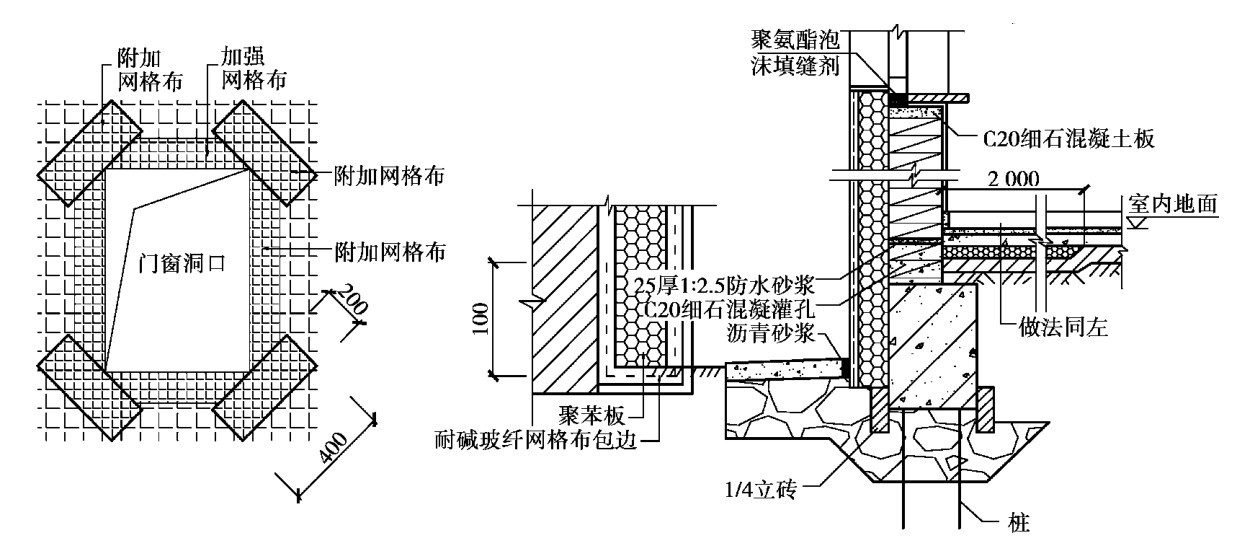 图13.23 门窗洞口处网格布加强构造与包边处理
