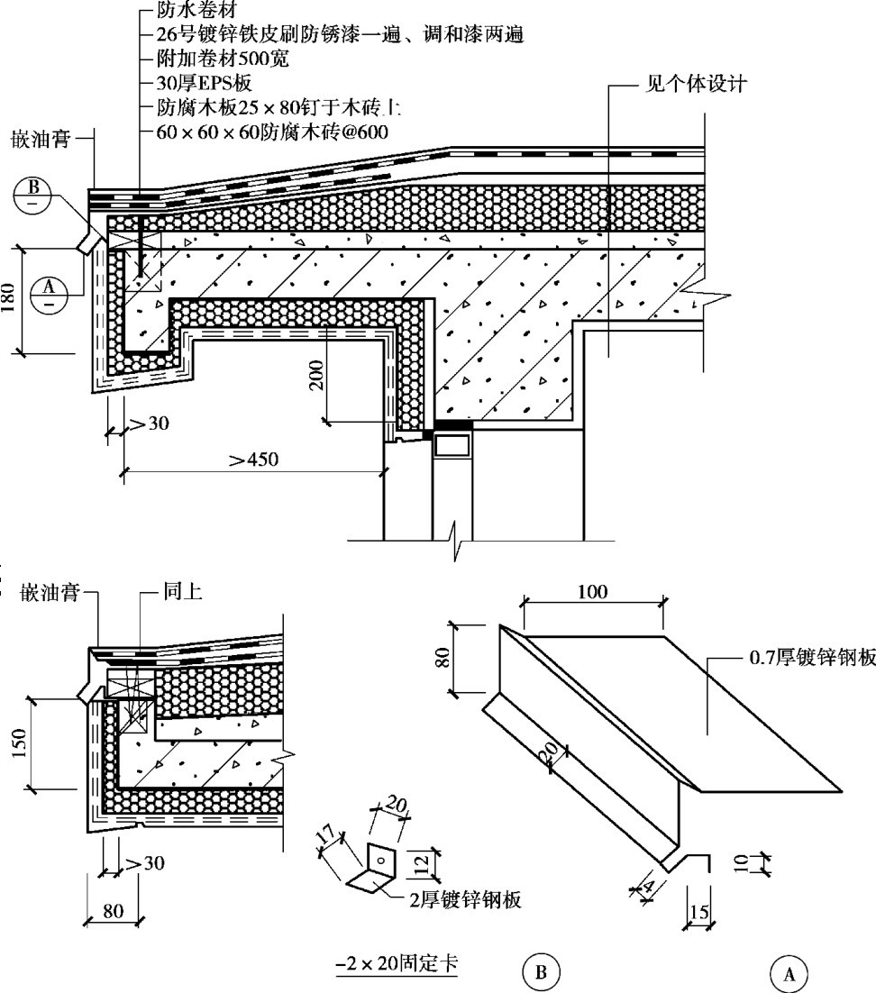 保温屋面构造前面已经叙述,此处不再赘述。 即使屋面设置保温层,但是在挑檐、天沟、女儿墙、雨水口及通风道等处依然是保温的薄弱环节,需要加强处理。 具体细部构造如图13.27—13.29所示。