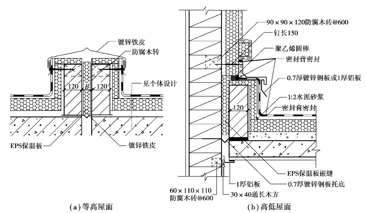 在节能建筑中,建筑物根据需要设置变形缝时,此处容易出现冷桥,成为节能建筑绝热保温的薄弱环节,影响建筑物整体的节能效果。 但是,在外围护结构节能设计与施工时,对于外墙、屋面、门窗等处的节能处理比较重视,变形缝处的节能问题往往被人忽视。 因此,要取得良好的节能效果,还要解决好变形缝处的节能构造,即在安装外墙装饰板或屋面盖缝板之前,应将保温材料塞入变形缝内,填塞密实。 待装饰盖板固定好后,再对变形缝两侧的保温层适度进行处理,严禁直接覆盖。 墙身变形缝与屋面变形缝节能构造如图13.36和图13.37所示。