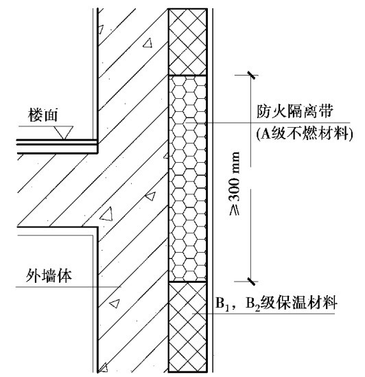 ②应在保温系统中,每层设置水平防火隔离带。 防火隔离带采用燃烧性能为A级的材料,防火隔离带的高度不应小于300mm(图13.39)。