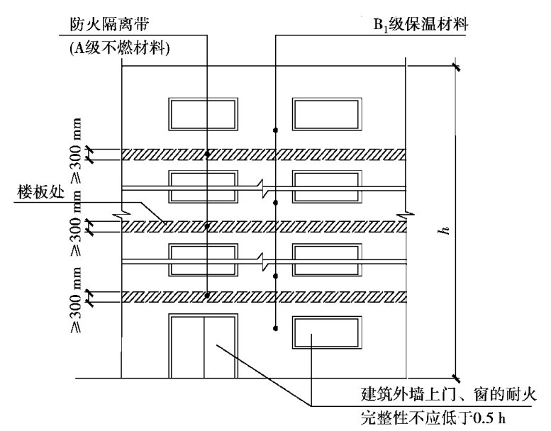 ①除采用B1级保温材料且建筑高度不大于24m的公共建筑或采用B1级保温材料且建筑高度不大于27 m的住宅建筑外,建筑外墙上门、窗的耐火完整性应不低于0.5 h(图13.38)。