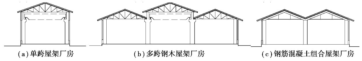 ①砖混结构厂房 采用砖柱或钢筋混凝土柱,屋面结构可按有关条件选用木屋架、钢木屋架、钢筋混凝土屋架或屋面梁等。 此类的柱距一般为4~6m,跨度≤15m(图14.11),适用于无吊车厂房或吊车起重量≤3t的中小型厂房。