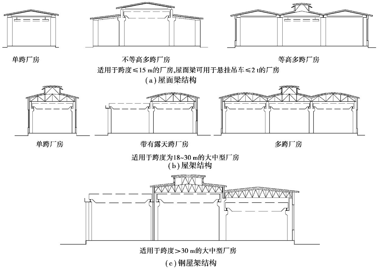 ②对中型厂房,一般多采用钢筋混凝土承重结构或预应力混凝土承重结构。