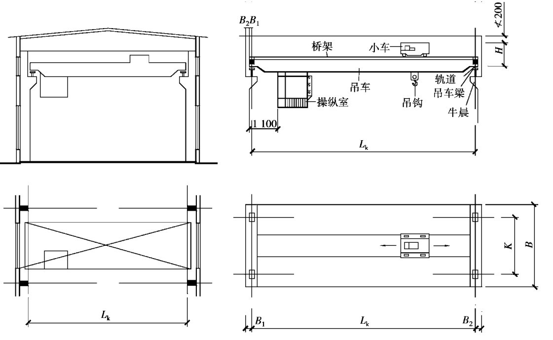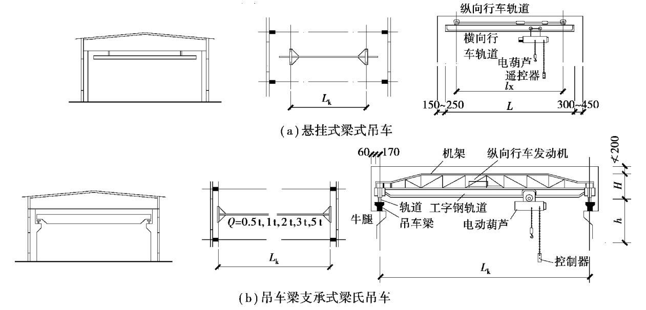 它是由梁架、工字钢轨道和电动葫芦组成。 梁架可以悬挂在屋架或屋面梁下弦的纵向轨道上,也可支承在吊车梁上的轨道上。 梁式吊车可以纵横双向运行,使用方便。 行车的操纵可以地面操纵,也可以设置操纵室凌空操纵。 梁式吊车的起重量有1t,2t,3t,5t这4种,吊车的跨度(LK)是厂房跨度(L)减去1m(图14.6)。