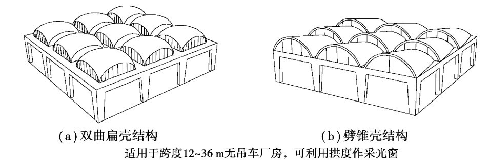 ③薄壳结构厂房(图14.17) 薄壳是一种曲面的薄壁结构。 它能充分发挥材料强度,能将承重与围护两种功能融合为一。 材料大多采用钢筋混凝土,它按曲面生成的形状分筒壳、圆顶薄壳、双曲扁壳和双曲抛物面壳等。 此种结构较为费工费模板。