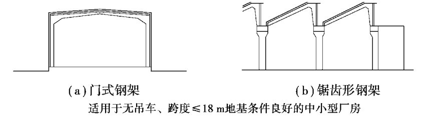 钢筋混凝土刚架常用于跨度≤18m(有的厂房跨度>18m,数量不多),一般檐高不超过10m,无吊车或吊车起重量在10t以下的车间(图14.14)。