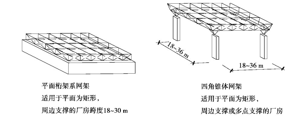 ②网格结构厂房(图14.16) 网格结构是杆件按一定的规律布置,通过节点连接而成的一种网状空间杆系结构。 它空间刚度大,整体性和稳定性好,有良好的抗震性能,适用于各种支承条件和各种平面形状、大小跨度。 它用钢量大,采用钢管时取材有一定困难,需要大面积采取防火及防腐蚀措施,屋面造价较高。 此结构外形呈平板状的称为平板网架;外形呈曲面状的称为曲面网架。