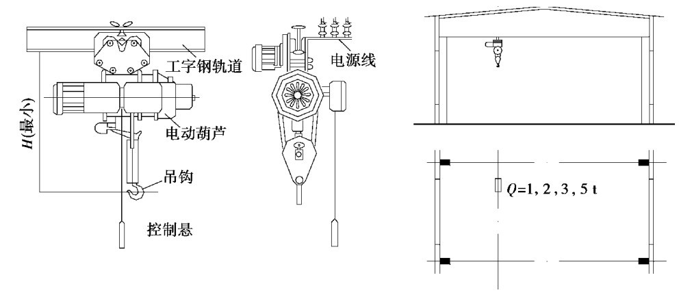 它是由电动葫芦和工字钢轨道组成。 电动葫芦以工字钢为轨道,可沿直线、曲线或分岔往返运行。 工字钢轨道可悬挂在屋架或屋面梁的下弦,因而对屋架或屋面梁的结构强度要求较高。 吊车起重量一般在2t左右,特殊情况下可达5t。 单轨悬挂式吊车构造简单,造价低廉,但它不能横向运行,需借助人力和车辆辅助运输,故适用于小型或辅助车间(图14.5)。