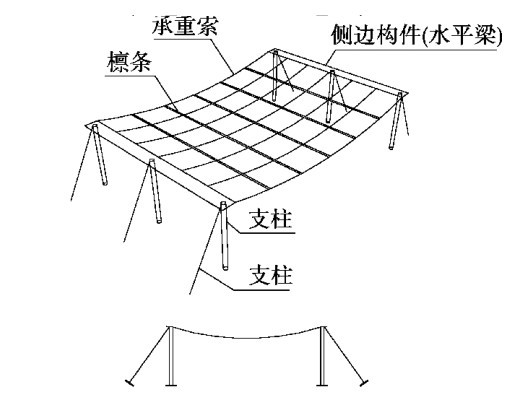 ④悬索结构厂房(图14.18) 这是以一系列高强钢索作为主要承重构件并按一定规律悬挂在相应支承结构上的一种张力结构。 它受力合理、自重较轻、耗钢量少,安装时不需要大型起重设备。 它能根据各种平面形状要求,组成不同的结构体系,并可较经济地跨越很大的跨度,适应生产工艺要求。 它有单层悬索结构、双层悬索结构、索网结构和混合悬挂体系等之分。