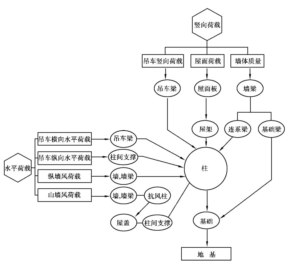 图14.10 单层厂房排架结构主要荷载的传递路线