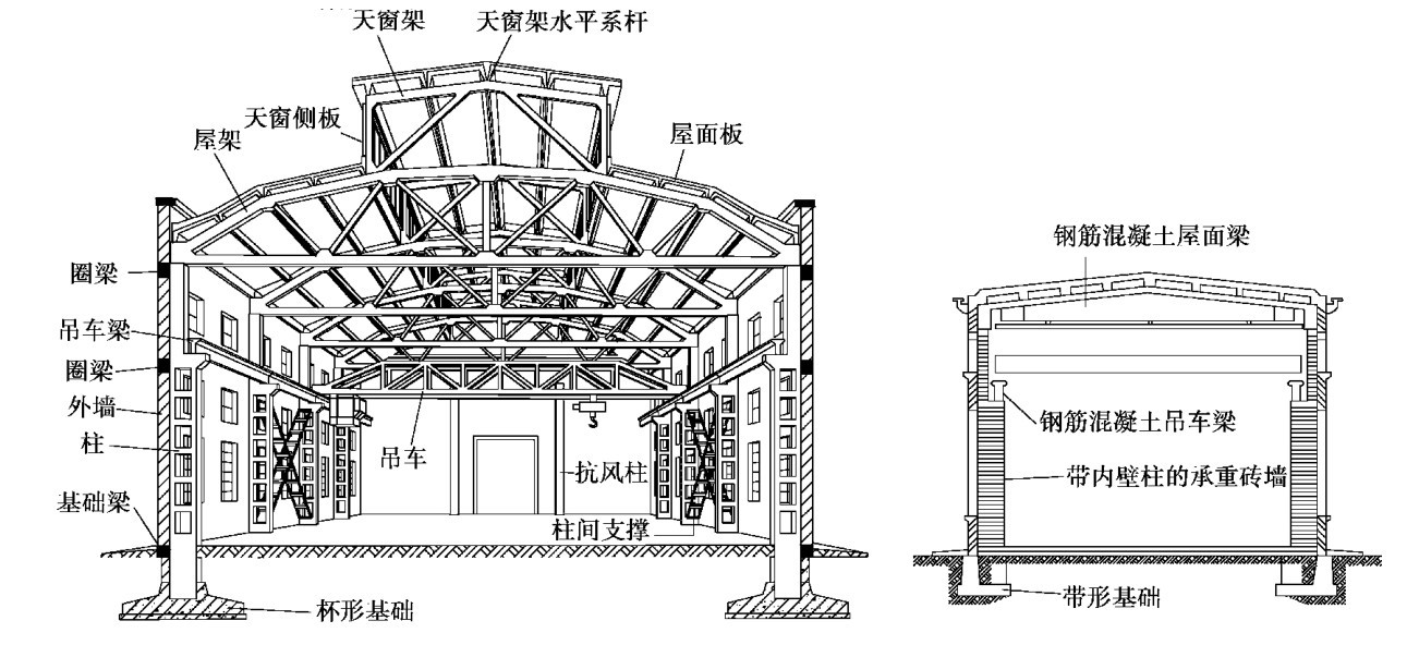 ①对小型厂房,一般多采用砖混承重结构或钢筋混凝土承重结构。