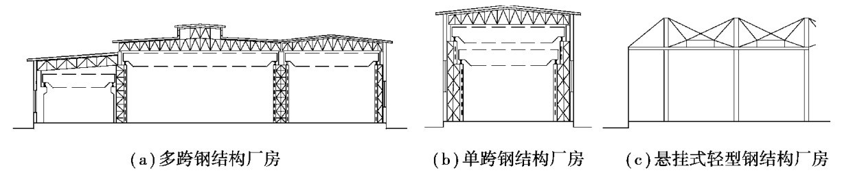 ③钢结构厂房 钢结构厂房,系采用钢柱、钢屋架作为厂房的承重结构。 一般柱距12m,也有将6m与12m柱距混合使用,跨度≥30m(图14.13)。