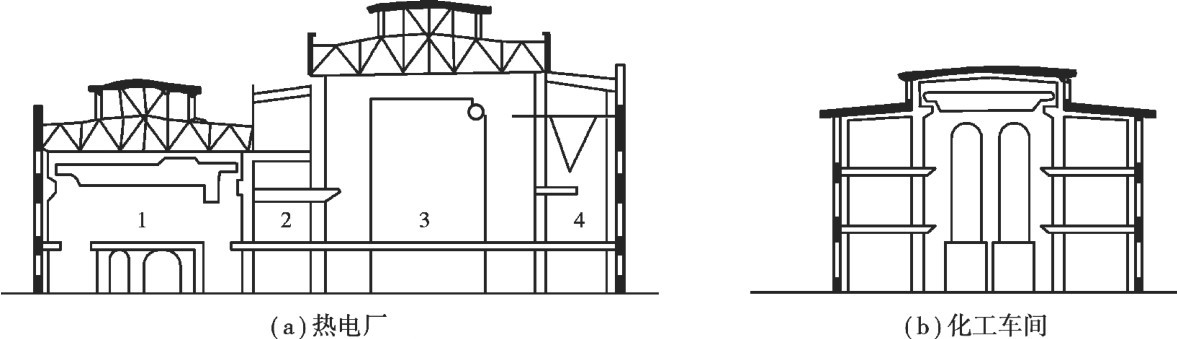 ③层次混合的厂房(图14.4) 厂房由单层跨和多层跨组合而成,多用于热电厂、化工厂等。 高大的生产设备位于中间的单跨内,边跨为多层。