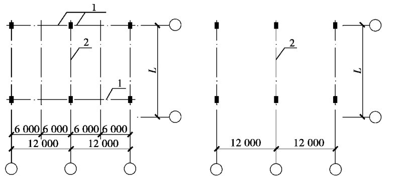 1—扩大柱距省去柱子;2—扩大柱距后增加的设备
