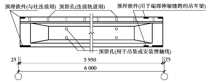 吊车梁两端上下边缘各预埋有铁件,以与柱连接用。 由于端柱处、变形缝处的柱距不同,在预制和安装吊车梁时,要注意预埋件设置位置的要求。 在吊车上翼缘处留有作固定轨道用的预留孔,腹部预留滑触线安装孔。 有车挡的吊车梁应预留与车挡构件连接用的钢管或预埋铁件(图15.15)。