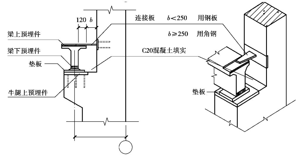 为承受吊车横向水平刹车力,吊车梁上翼缘与柱间用钢板或角钢焊接;为承受吊车竖向压力,安装前用车梁底部应焊接上一块垫板与柱牛腿顶面预埋钢板焊接。 吊车梁与梁之间、吊车梁与柱之间的空隙均需用C20细石混凝土填实(图15.16)。