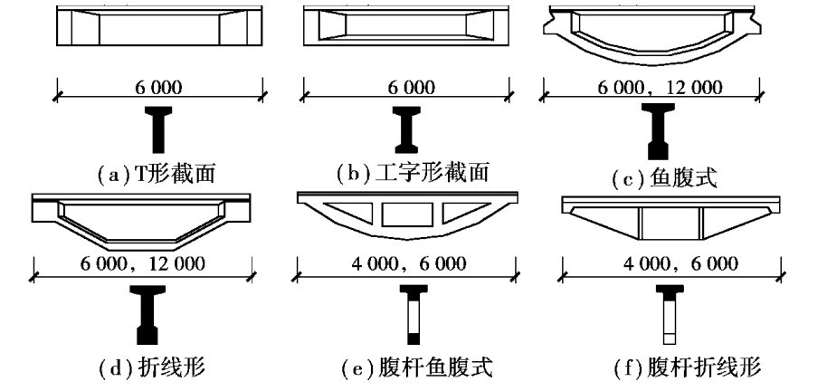 钢筋混凝土吊车梁的类型很多,按截面形式分,有等截面的T形、工字形吊车梁,元宝式吊车架、鱼腹式、空腹鱼腹式吊车梁等(图15.14)。 吊车梁可用非预应力与预应力钢筋混凝土制作。 下面介绍常用的吊车梁:
