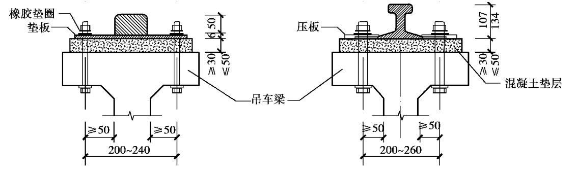 吊车轨道控吊车吨位确定其断面和型号,可分为轻轨、重轨和方轨,按各种吊车的技术规格推荐用型号选定,吊车轨道与吊车梁的连接一般采用橡胶板和螺栓连接的方法,即在吊车梁上铺设厚30.50mm的垫层,再放钢垫板(或塑料、橡皮等弹性垫板),垫板上放钢轨,钢轨两侧放固定板,用压板压住,压板与吊车梁用螺栓连接牢固(图15.17)。
