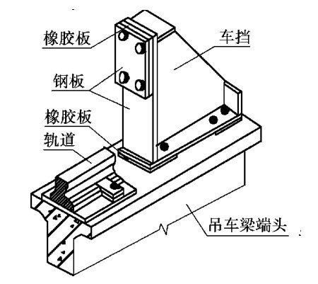 为防止吊车行驶中来不及刹车而撞山墙,同时限制吊车的行驶范围,应在吊车梁的尽端设车挡(又称止冲器)。 车挡大小与吊车起重等有关,车挡用钢材制作,上面固定橡胶板,用螺栓与吊车梁的翼缘相连接,可按全国通用标准图选用(图15.18)。