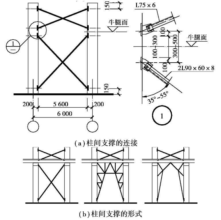 ②当吊车轨顶标高≥10m时,柱间支撑宜做成两层;当柱截面高度≥1.0m时,下柱支撑宜做成双肢,各肢与柱翼缘连接,肢间用角钢连接。