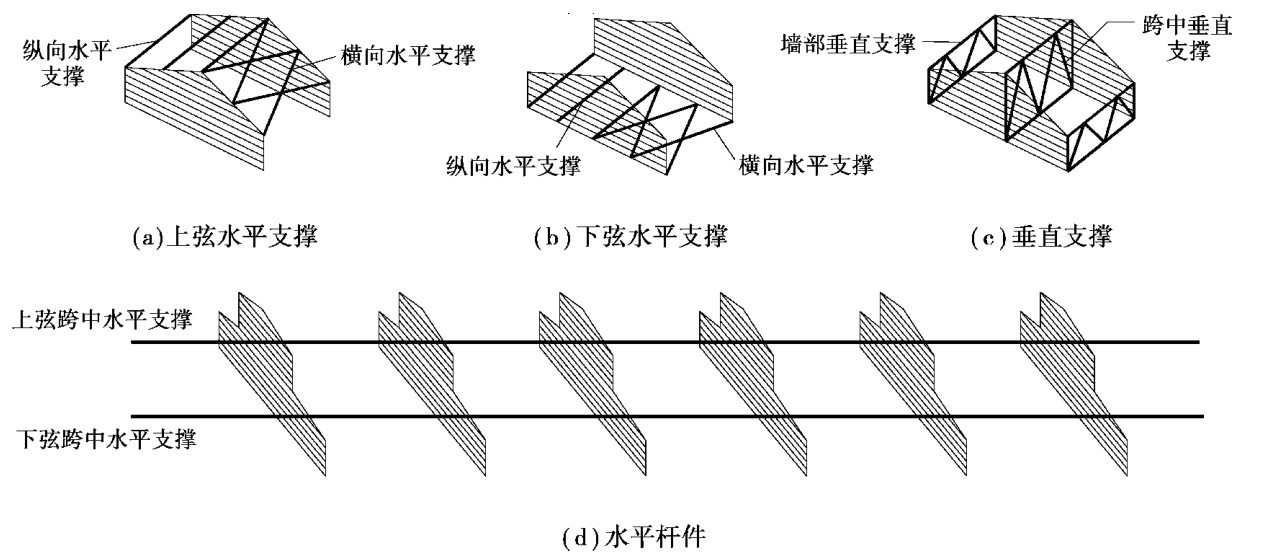 包括上、下弦横向水平支撑,上、下弦纵向水平支撑,垂直支撑和水平系杆(加劲杆)等(图15.19)。 横向水平支撑和垂直支撑一般布置在厂房端部和伸缩缝两侧的第二或第一柱间上。