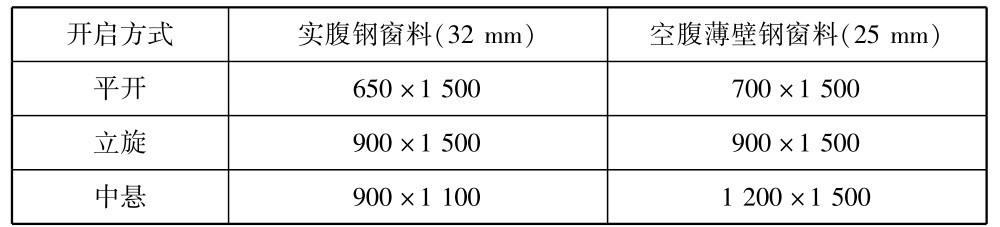 表16.2 钢窗开启扇最大尺寸(宽×高,mm)