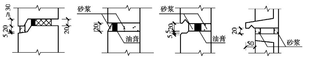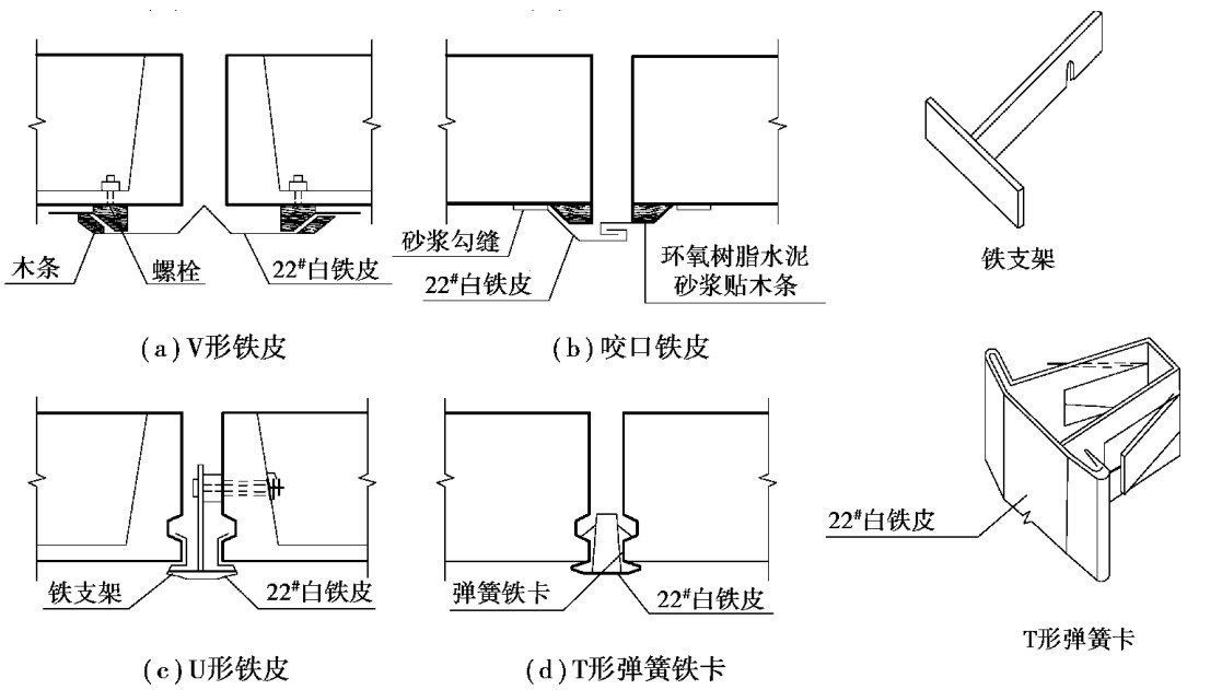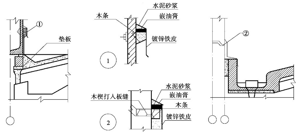 板缝可以做成各种形式。 水平缝有平口缝、高低错口缝、企口缝等。 企口缝的处理方式较好。 但从制作施工以及防雨水的重力和风力渗透等考虑,错口缝较为理想,一般多为采用。 水平板缝形式及缝的处理如图如16.14所示。 垂直板缝可做成直缝、喇叭缝、单腔缝、双腔缝等形式。 垂直板缝的处理如图16.15所示。 在墙板变形缝处,通常采用22号镀锌铁皮盖缝,其构造如图16.16所示。 在降雨量较大的地区,墙板垂直缝两侧板面上,应根据制作条件设阻水凹槽或阻水边坎,如图16.17所示。