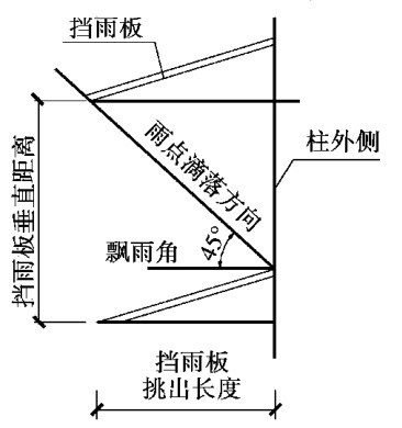 挡雨遮阳板每排之间的间距,与当地飘雨角度、日照以及通风等因素有关,设计时应结合车间对防雨的要求而定。 一般飘雨角取45°,对风雨较大的地区可酌情减小角度(图16.28)。