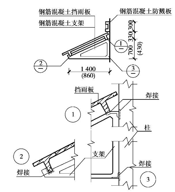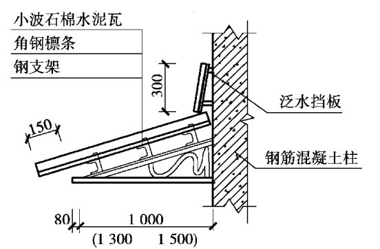 石棉水泥瓦挡雨遮阳板由钢支架、钢檩条、中波石棉水泥瓦板和防溅板组成。钢支架与柱上预埋铁件连接。它质量轻、施工简便、拆装灵活,但瓦脆易损坏,适用于一般热加工车间(图16.29)。