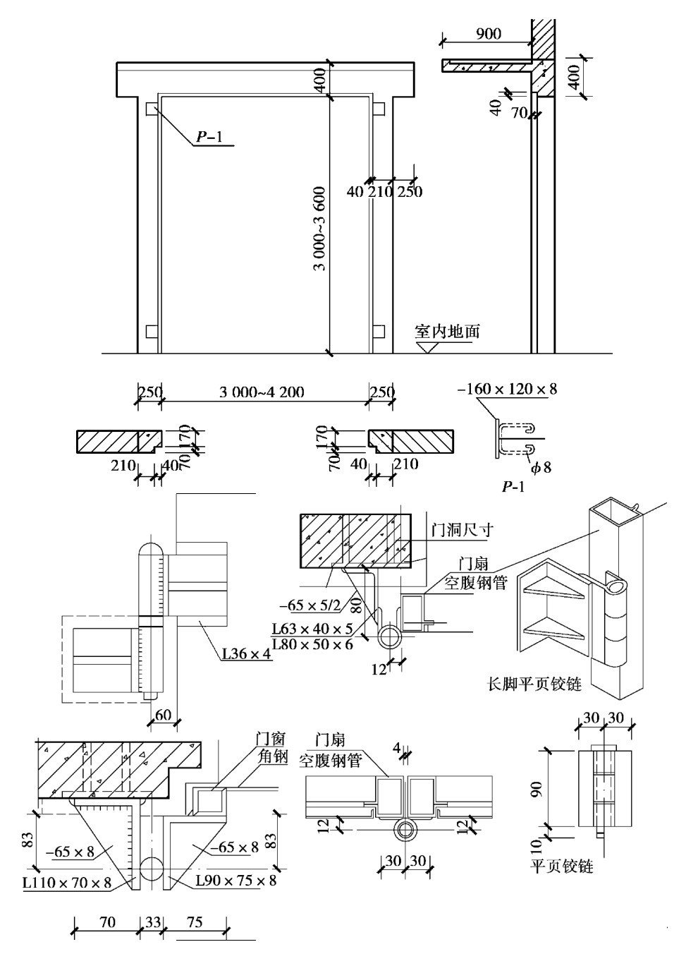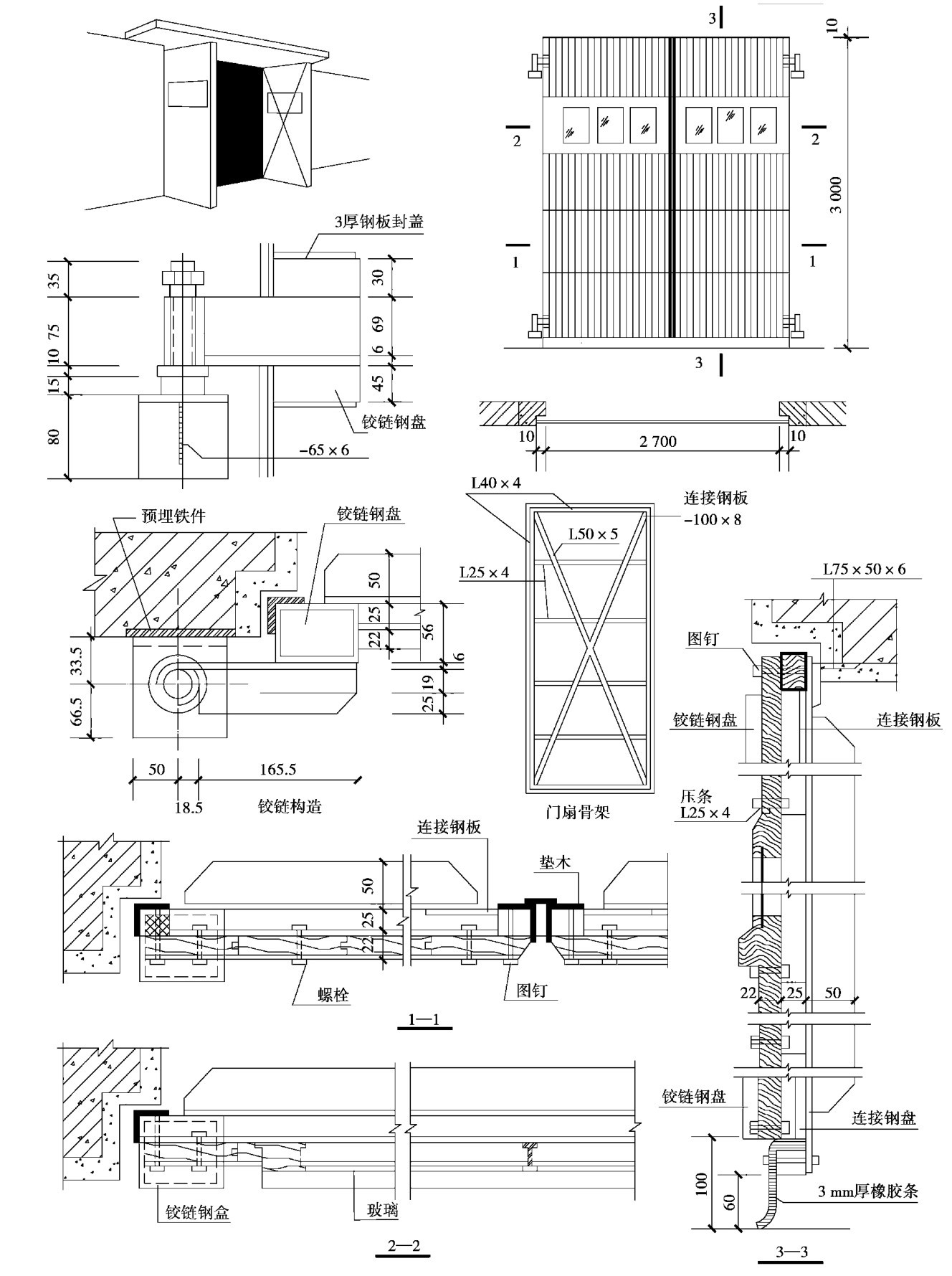 厂房的平开大门同样是由门框、门扇与五金配件等组成。 门扇有木制、钢板制、钢木混合制等,当门扇面积大于5m2时,宜采用钢木混合或钢板制作(图16.43)。