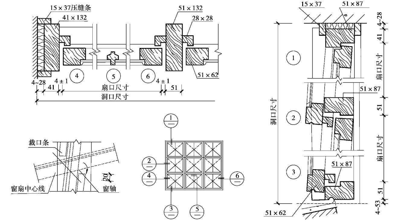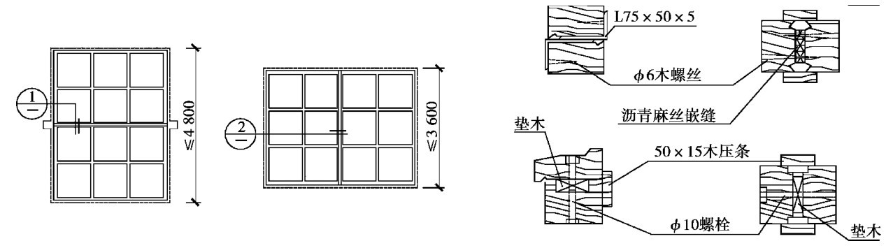 ①木侧窗的拼框组合 在我国现行木侧窗标准图集中,洞口大于3600mm×3600mm的侧窗。 均由两个基本窗拼框组成。 拼接采用ϕ10螺栓或ϕ6木螺栓、中距1000mm将两个窗框连接起来。 用螺栓连接时,应在两框间加垫木,框间缝隙嵌入沥青麻丝,缝隙内外两侧有木盖缝条(图16.32)。