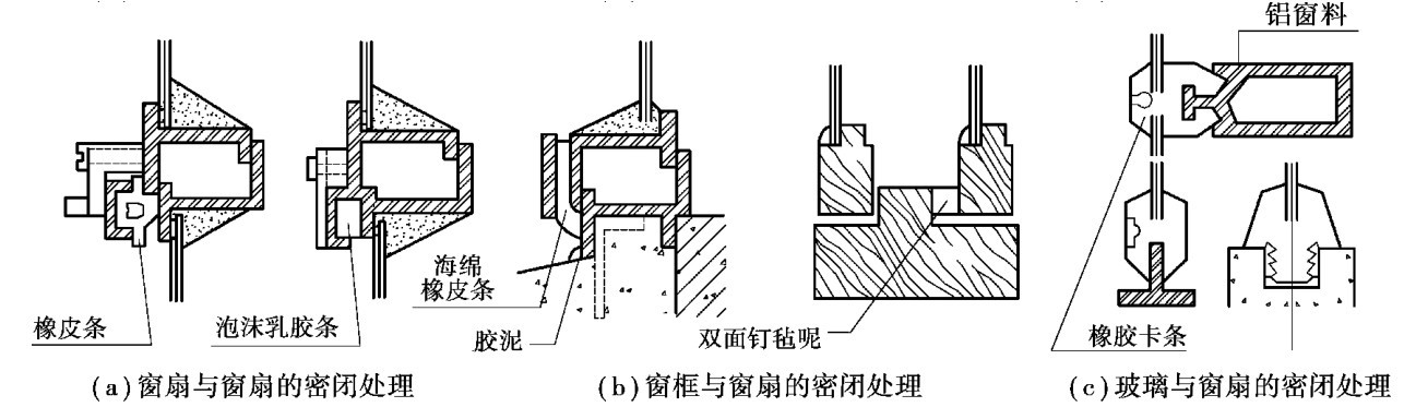 ①密闭窗 密闭窗适用于有防尘、保温、隔声等要求的车间,窗要能密闭,首先应尽量减少窗中的缝隙,必须减少窗面积和开启扇,使缝隙达到最少;其次应作好窗扇的密闭处理,可用橡皮条、泡沫乳胶条或毡呢条等粘贴或钉窗扇与窗框之间的缝隙处,玻璃与窗框的连接可用橡皮条或增加油膏等措施来满足密闭的要求。 密闭窗多采用双层玻璃窗或双层中空玻璃窗,以保证密闭的效果(图16.40)。