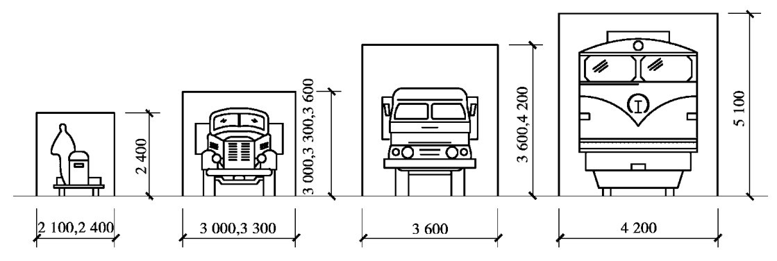 目前,单层厂房常用的运输车辆有以下4种类型(图16.41)。 常采用的洞口尺寸为:
